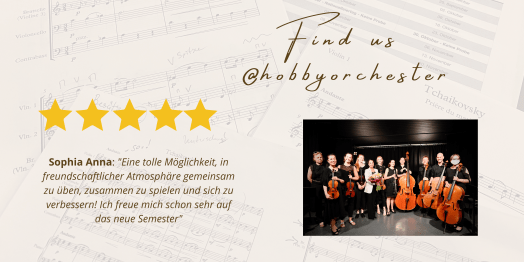 Alle, die Musik für Spaß machen, aber trotzdem von den Profis lernen wollen, werden wir mit offener Tür und vielen Musikkenntnissen begrüßen. Als Ziel stellen wir einen unvergesslichen Abschluss-Konzert am Ende des Jahresprojekts. Da wird von unseren Orchesterstudenten nicht nur eine größere Bühne getroffen, sondern auch die Möglichkeit, mit Profi-Musikern zu spielen und davon lernen zu dürfen.